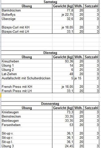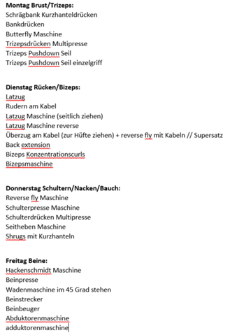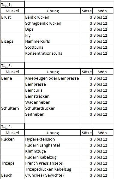 Der Trainingsplan ist ein sogenannter Zweiersplit Das bedeutet Du teilst das Training deines gesamten Körpers auf zwei Trainingstage auf An einem Trainingstag trainierst du Beine, Brust und Trizeps, am nächsten Rücken, Bizeps, Schultern und Bauch. Vorab ist zu sagen, dass der 3erSplit Trainingsplan für Fortgeschrittene mit einer Trainingserfahrung beim Fitnesstraining von mindestens vier Monaten zu empfehlen ist Denn das Splittraining ist kein Training für „blutige Anfänger“ Grund dafür ist, dass sich Gelenke, Knochen, Muskulatur, Bänder und Sehnen erst einmal an die Trainingsreize gewöhnen müssen. Ich hab erstmal einen Trainingsplan erstellt, wennn ich nach diesem trainiere, würde ich Montags Schultern,Rücken und Nacken trainieren, Mittwochs Beine und Freitags Bizeps,Trizeps und Brust Zusätzlich mache ich jeden Trainingstag noch3 unterschiedliche Übungen für die Bauchmuskulatur.