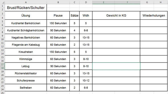 Oberkörper Trainingsplan PDF Top 6 1) Oberer Rücken, Bizeps Einarmiges Rudern Du erreichst dadurch den größtmöglichen Muskelreiz für deinen Brust Muskelaufbau 3) Unterer Rücken Gestrecktes Kreuzheben Zielmuskeln Zu den besten Übungen für den unteren Rücken zählt definitiv das gestreckte Kreuzheben mit Kurzhanteln Lediglich. Bei iShapely verraten wir dir alles über das Training mit dem Theraband und für wen es am besten geeignet ist Außerdem geben wir dir nicht nur die Vorteile des Workouts, sondern auch verschiedenste Übungen für den ganzen Körper mit an die Hand Farben & Stärken Übungen Trainingsplan. Außerdem bringt ein so extrem hohes Trainingsvolumen bei einem Trainingsplan keinen Mehrwert Es braucht keine 8 Übungen á 3 Sätze mit 8 bis 12 Wiederholungen, um der Brust, dem Rücken, den Beinen oder gar kleinen Gruppen, wie Schultern oder Arme den nötigen Wachstumsreiz zu geben.